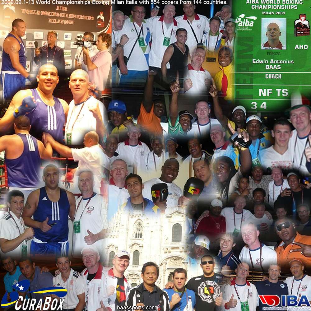 The international boxing world didn’t know The Netherlands Antilles, but Benjey Zimmerman changed that at the AIBA World Championship in Milan Italia with a victory over Ali Khaleel Salman (Iraq) in +91 kg. Prior to this World Championships, Benjey boxed a test bout with the current world champion and super heavyweight gold medal winner of the Olympic Games of Beijing 2008 Roberto Cammarelle from Italy. This went so well that Camarelle asked Benjey to be his sparring partner. In the photo compilation; Roberto Camarelle, Domenico Valentino (won just like Camarelle gold for Italy during this World Cup), Husnu Kocabas & Orhan Ozturk form Team NL and team members of Macedonia, Slovenia, Grenada, Jamaica, US Virgin Islands, Panama, Bahamas, Japan, Thailand, Samoa, USA, etc. Malta, Scotland, Congo, Switzerland, Gambia, Sweden, etc.
