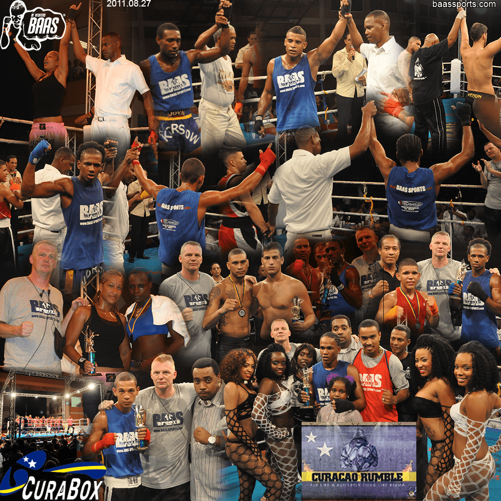 Baas Sports with 6 victories in Boxing and 1 in MMA @ Curacao Rumble. Ziani Fluonia won the ladies bout, Jemuel Cleofa won Mercera (Bonaire) by RSC-3, Raul Franciska won Janzen (Bonaire) by RSC-1, Mohamed Hussein won Gonzalez (The Netherlands), Sarabia won Koolman (Aruba), Justin Gogulski won Pardo by RSC-2 and Argenio Pieters won Croes (Aruba).