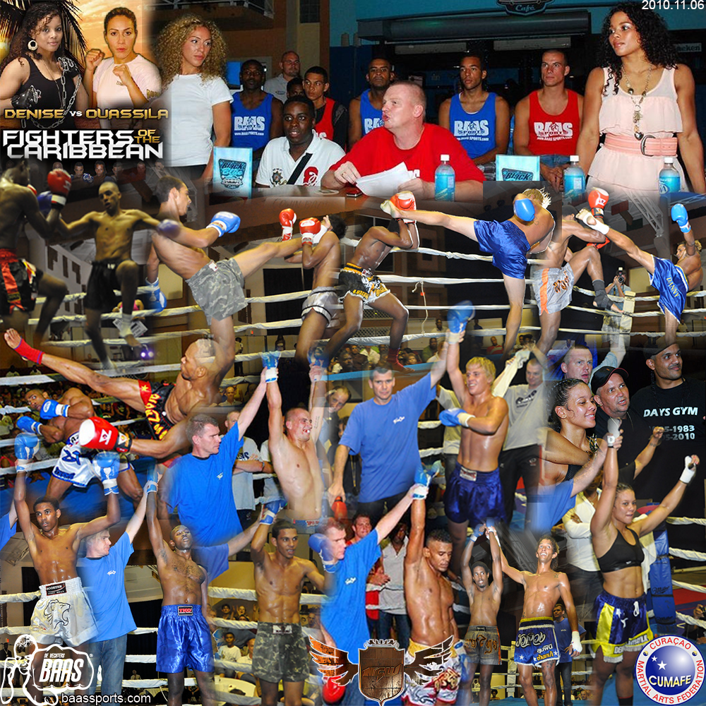 CUMAFE 2nd Fighters of the Caribbean with Bonaire, Suriname, Martinique, Sint Maarten, USA, Morocco, The Netherlands and Curacao. Baas Sports had 8 fighters in international fights with 6 victories and only 2 losses. Crispulo, Ruben Schot, Argenio Pieters, Justin Gogulski, Joost Mulder, Raul Franciska all won. Denise Kielholtz (Days) won the main event.